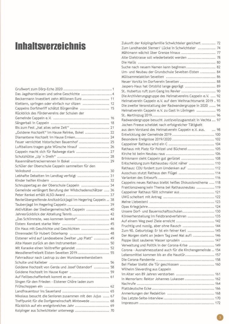 Die Redaktion des „Dörp-Echos“ freut sich, dass das „Dörp-Echo 2020“ auch nach erschwerten „Corona-Arbeitsbedingungen“ wieder erschienen ist. Es umfasst dieses Mal 174 Seiten in Farbe, reich bebildert und mit vielen interessanten Beiträgen aus der Geschichte und der Gegenwart.