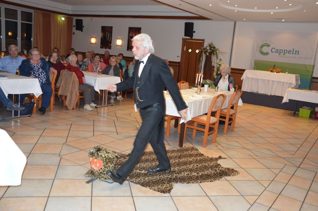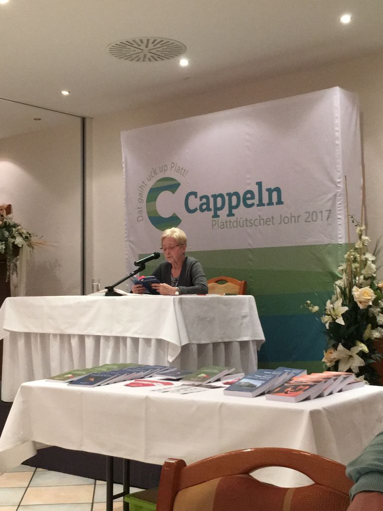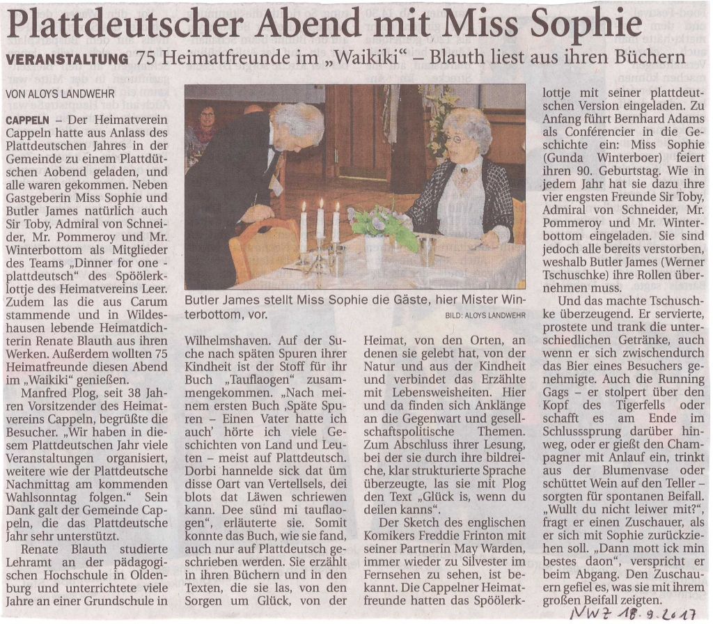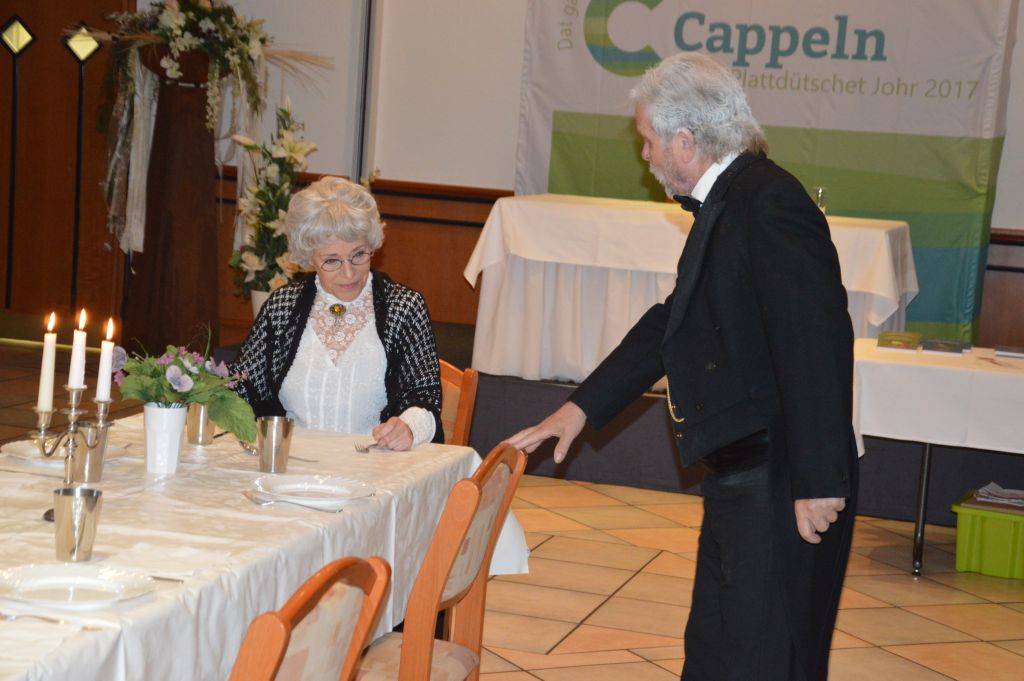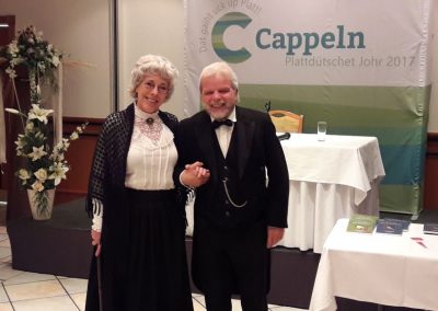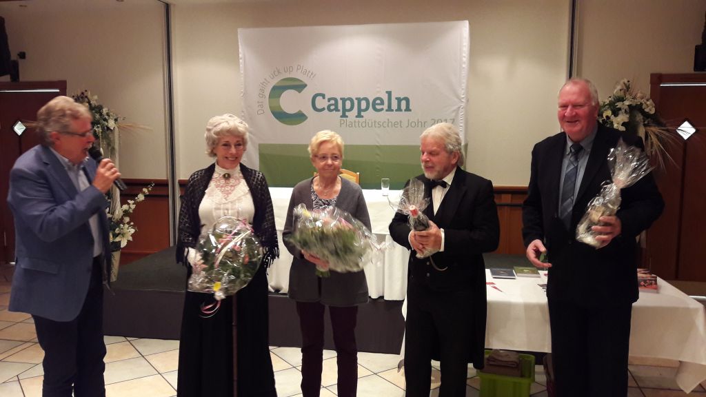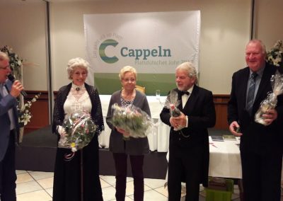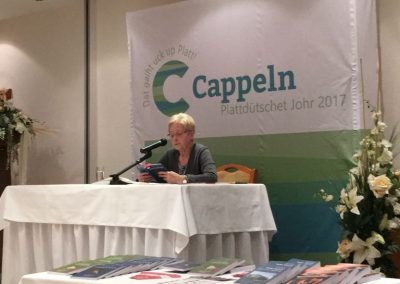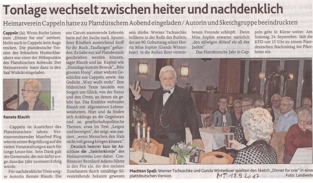 Der Vorstand des Heimatvereins Cappeln e.V. hatte im Rahmen des „Plattdeutschen Jahres 2017“ zum „Plattdütschen Aobend“ im Saal Waikiki in Cappeln eingeladen. Akteure waren die plattdeutsche Autorin Renate Blauth aus Wildeshausen und das „Dinner-Team“ des „Spöölerklottje“ des Heimatvereins Leer. Unter den Gästen befand sich auch der stellvertretende Bürgermeister Christoph Eilers und der Vorsitzende Alfred Kuhlmann des Arbeitsauschusses „Plattdeutsch“ im Heimatbund für das Oldenburger Münsterland, Alfred Kuhlmann , die der Vorsitzende Manfred Plog besonderes begrüßte. Zum Schluss bedankte sich Plog bei Renate Blauth und der Theatergruppe mit einem Blumenstrauß bzw. einem „guten Tropfen“ Die Veranstaltung erfuhr eine positive Resonanz bei allen Besucherinnen und Besuchern. Auch die lokale Presse erwähnte den Abend mit einem ausführlichen Bericht.